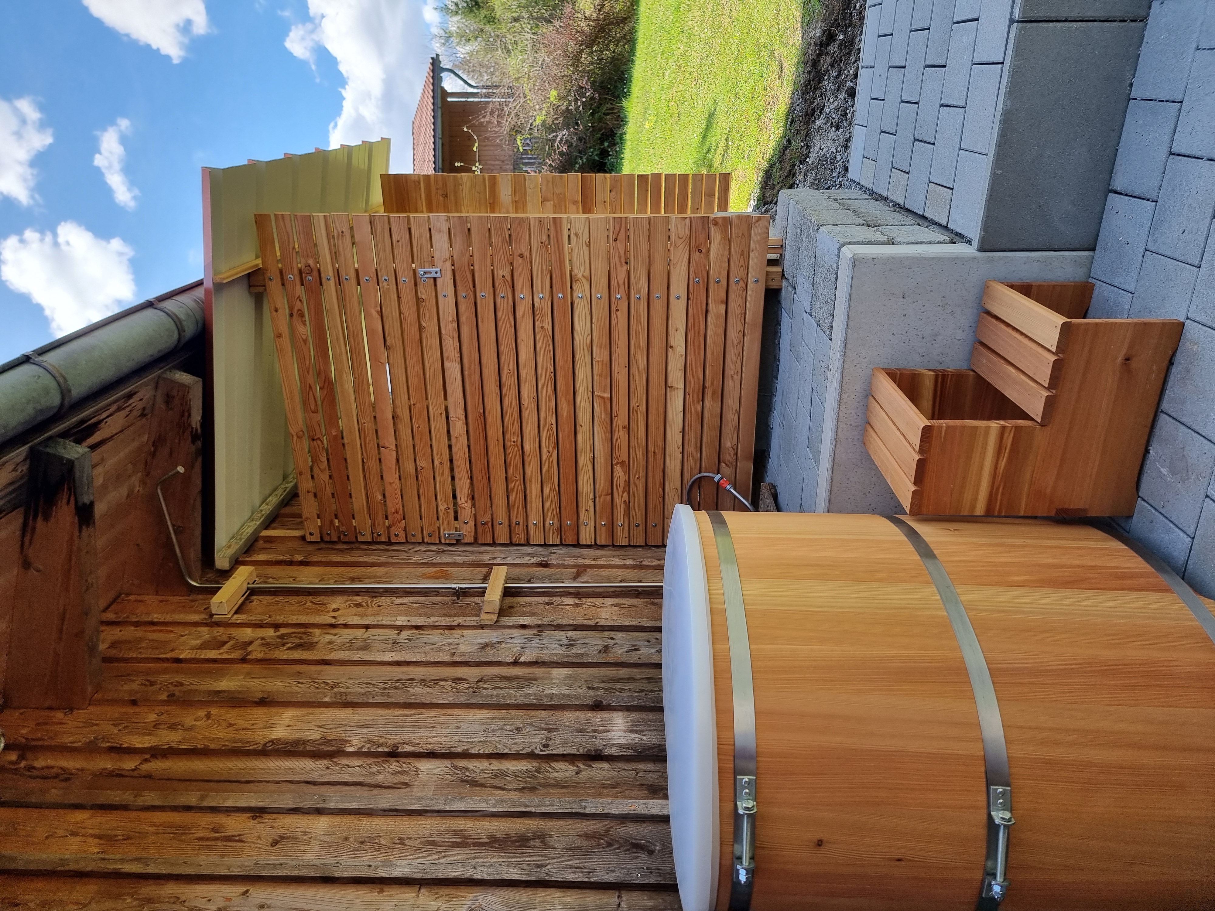 Hinter dem Gartenhaus finden Sie eine Aussendusche und ein Tauchbecken.